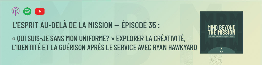 Ryan communique ses réflexions au sujet de l’identité et de la raison d’être après avoir quitté les forces armées, ainsi qu’à la façon dont le jeu d’acteur et l’improvisation ont contribué à son rétablissement à la suite de son diagnostic de trouble de stress post‑traumatique (TSPT). Les trois explorent le rôle de la créativité et des arts comme voies vers la quête de sens dans la vie après le service militaire.